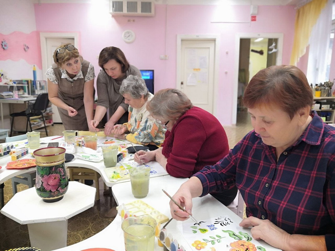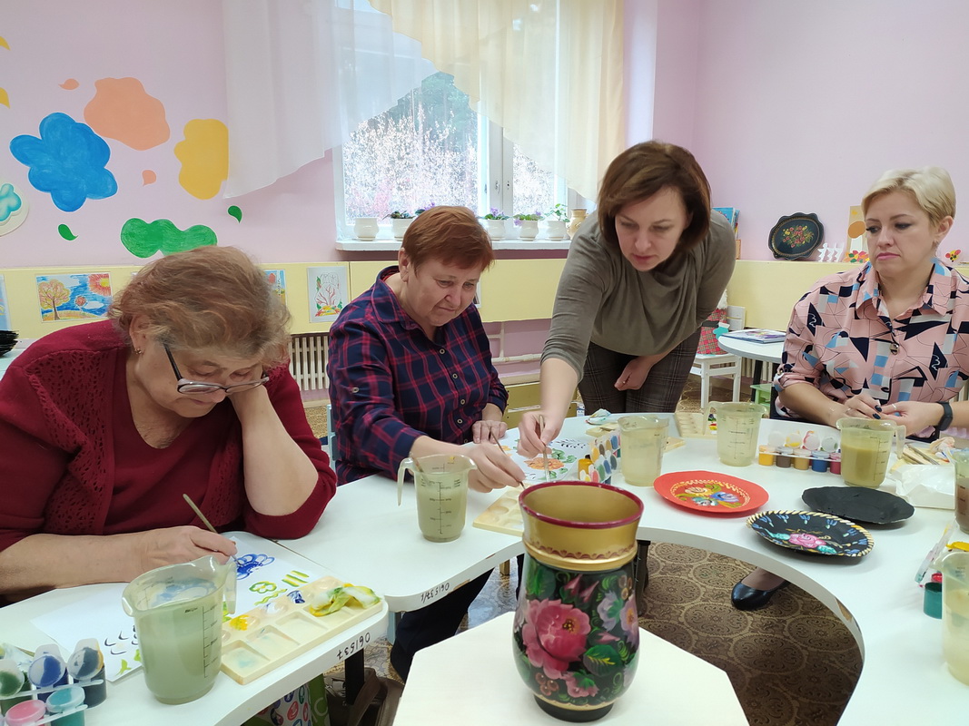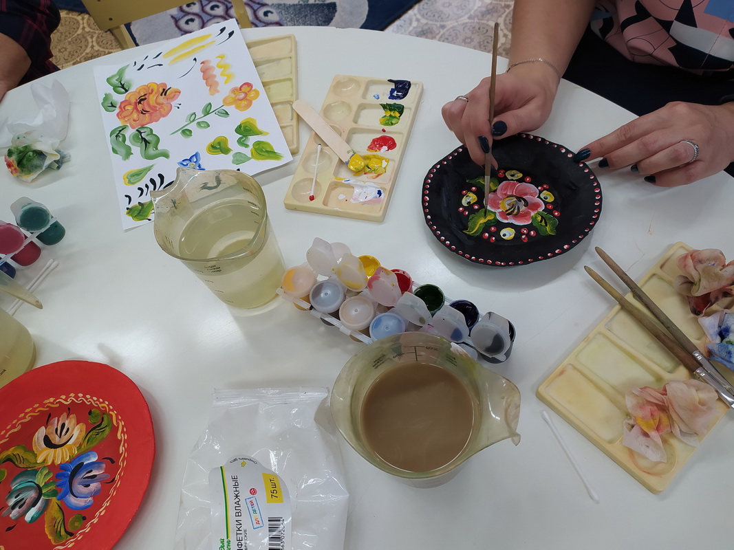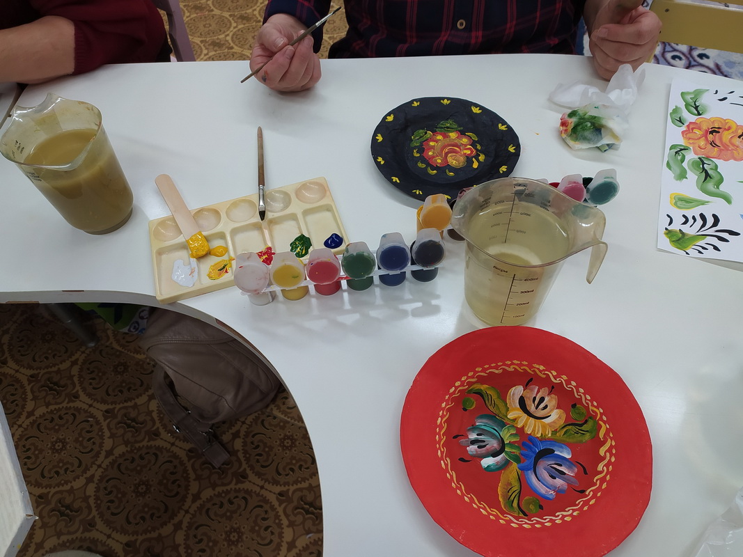 С удовольствием наши женщины старались усвоить азы данной росписи, украшая тарелочки, выполненные в технике папье-маше. Почти 2 часа за приятной беседой и слушанием классической музыки создавались новые шедевры, которые будут радовать внуков бабушек.